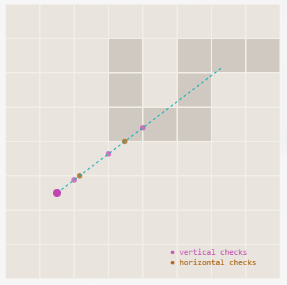 A naive approach would step along the ray in tiny increments and check the grid cell at each point. This is slow and imprecise. DDA instead jumps directly from one grid boundary to the next — it only checks the exact points where the ray crosses a grid line.