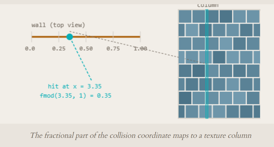 When a ray hits a wall, the collision point's fractional coordinate tells us where on the wall face we hit. If we hit a north/south-facing wall (horizontal wall line), the x-coordinate's fractional part gives us the texture column: