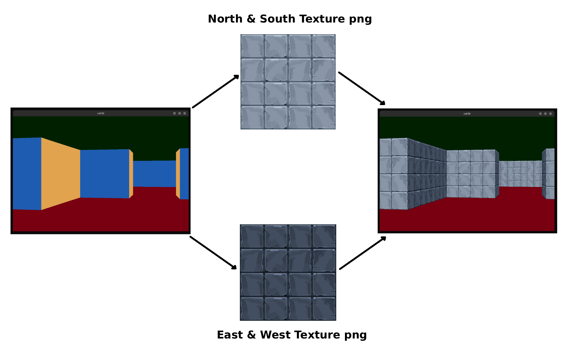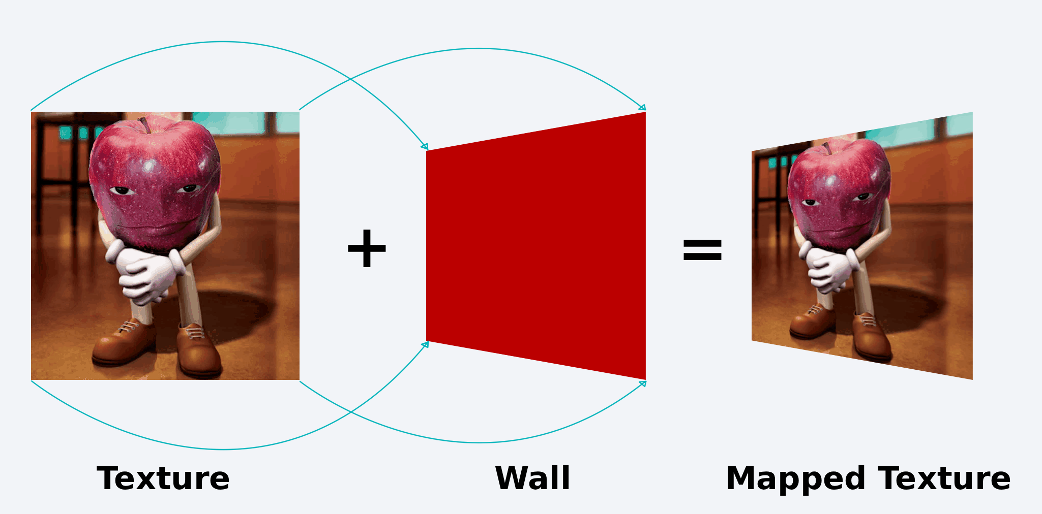 Flat-colored walls would be boring. We map a PNG texture onto each wall strip.