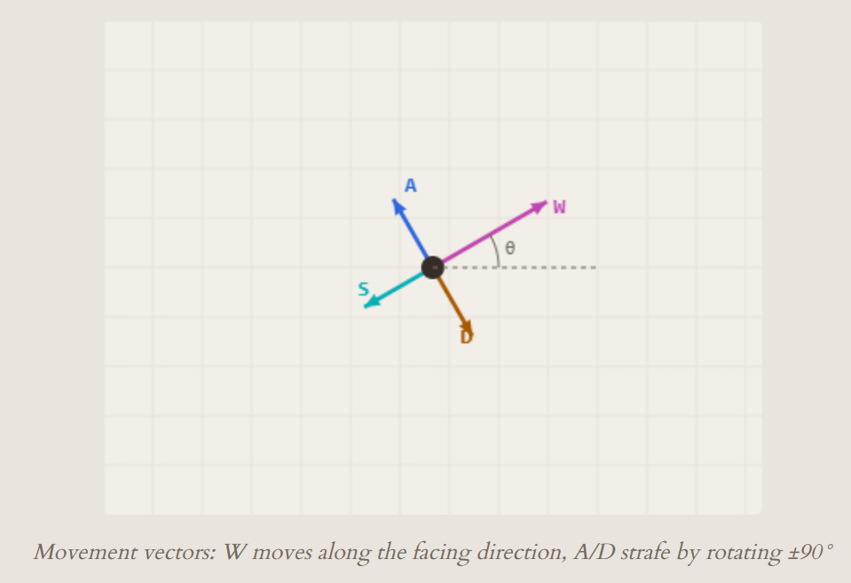 This gives a direction vector scaled by the movement speed. For strafing (moving sideways), we temporarily rotate the player's angle by 90° before computing the vector, then restore it: